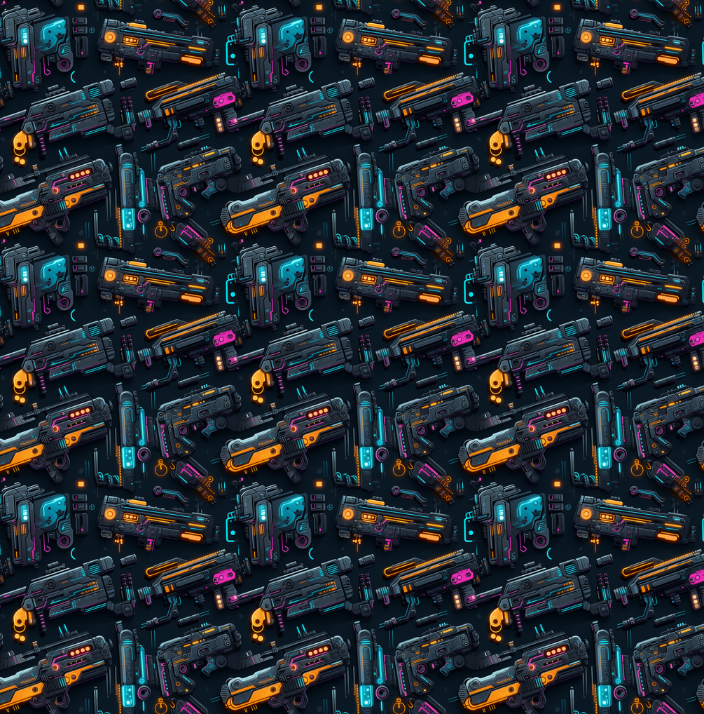 Featuring this bundle of 4 awesome looking gun patterns, all within the theme of cyberpunk and robotic. You can download them as collectibles, digital art print. I have made them from a range of tools, including A.I ideas from Chat GPT., I chose the topic of toys since it yields the most mesmerising results! I mean would you just look at their patterns >.<